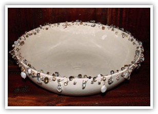 KOM JUWELENRAND ![]() Witte kom met juwelenrand in naturel en blauw tinten. Gemaakt van zilverdraad met kristallen, halfedelstenen en zoetwaterparels. |